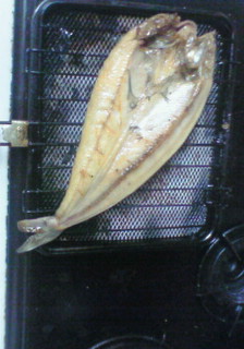 魚、食べよう。<「食べるぞ!」と言って、ほっけをハフハフして食べる。